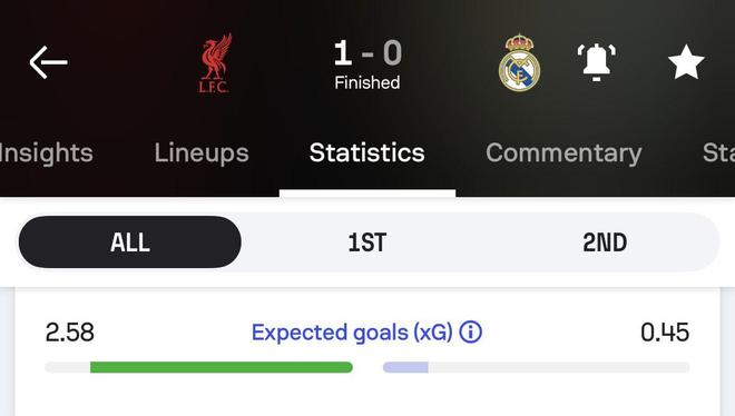北京时间11月5日,在欧洲冠军联赛阶段第4轮的对决中,利物浦以1-0战胜皇家马德里。赛后,知名统计机构Sofascore Football给出了皇马的预期进球,皇马最近四年欧冠对阵英超球队预期进球都是最低的。